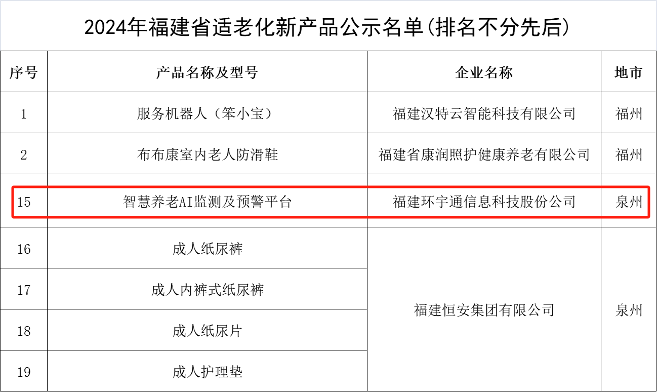2024年11月19日,2024年福建省适老化新产品公示名单公布,全省有24款产品位列名单,泉州共有五款产品入选。其中金年会jinnian依托技术积累和创新能力所推出的“智慧养老AI监测及预警平台”入选该名单。这一荣誉不仅是对公司在“AI+医疗康养”领域的长期努力和贡献的肯定,更是对未来持续创新与高质量开展的激励。
